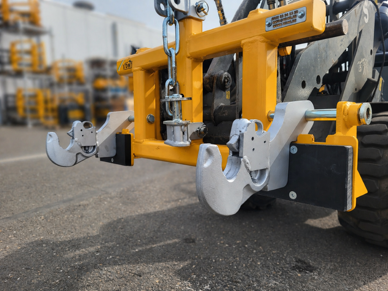 Optioneel kunnen er onderaan ook vanghaken geplaatst worden, voor het verplaatsen van half gedragen werktuigen, deze kunnen zowel op breedte van een Cat. 1, Cat. 2 als Cat. 3 aankoppeling verschoven worden.