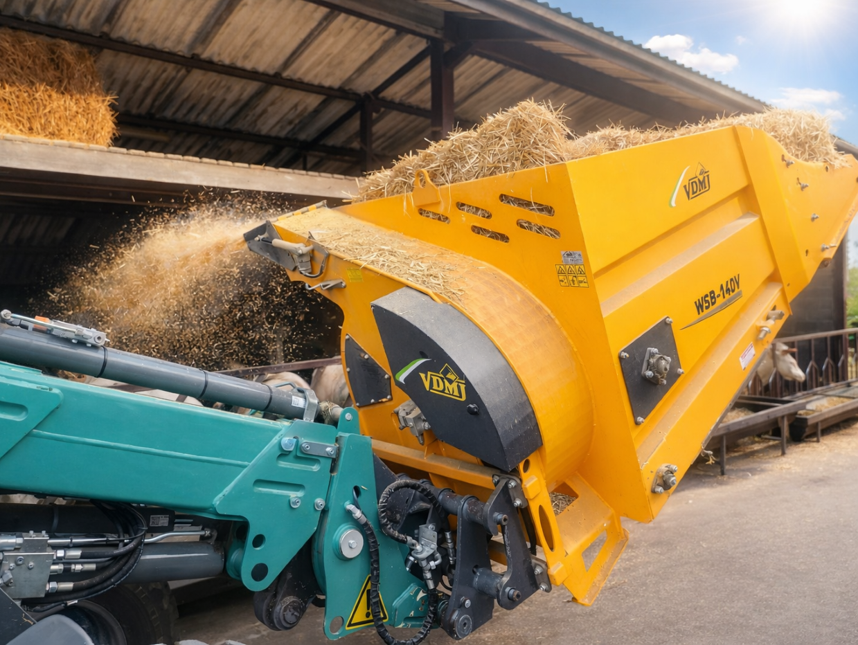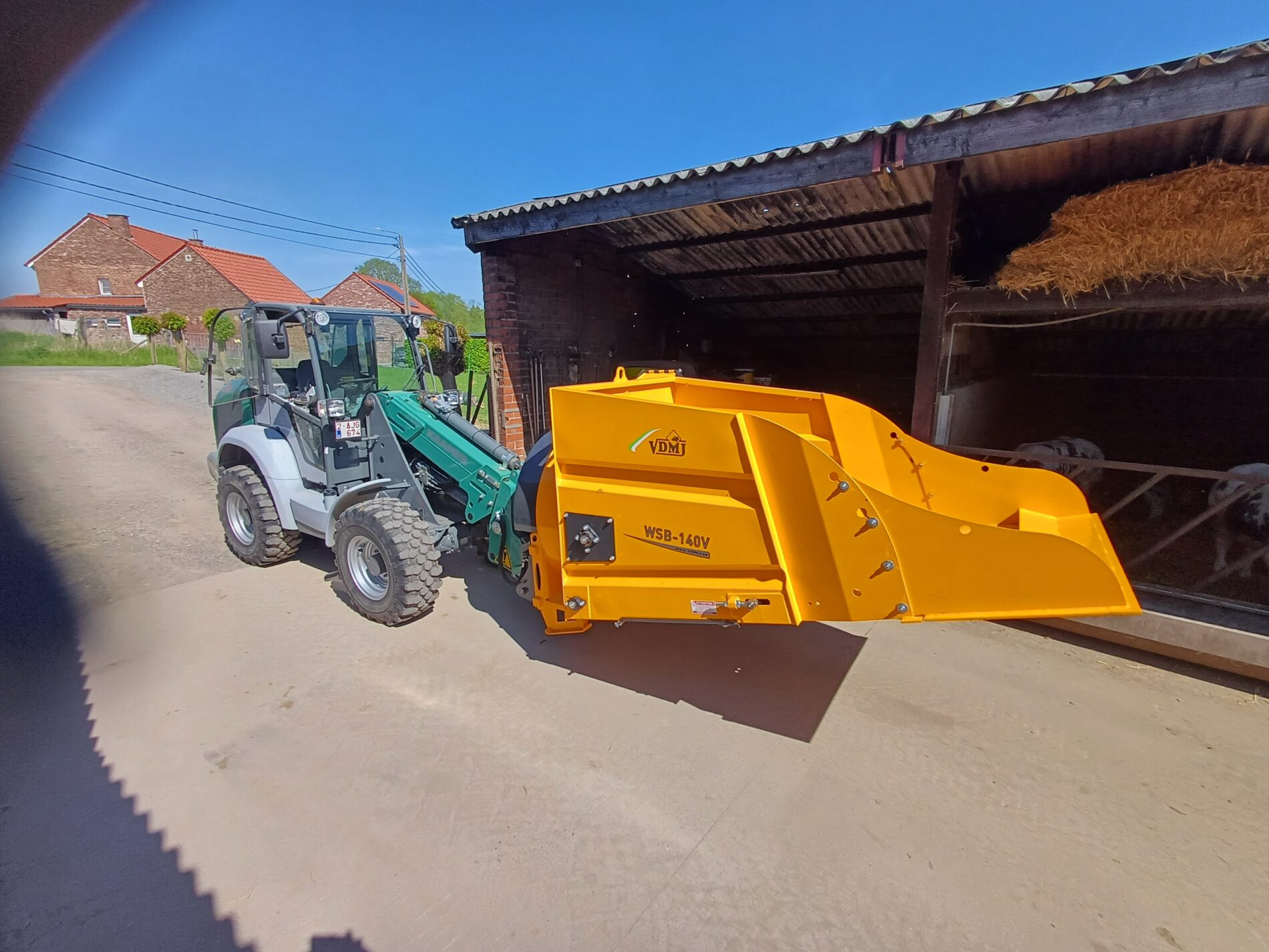De WSB-140V is een mini stroblazer met een gewicht van 680kg. Deze is speciaal ontwikkeld voor kleine shovels, knikladers en schrankladers vanaf een eigengewicht van 1700kg en met een minimaal oliedebiet van 35l/min. Zowel vierkante als ronde balen kunnen met de stroblazer verwerkt worden. Deze WSB-140V heeft een laadlengte van 1,40m en is standaard uitgerust met een vaste blaasuitgang aan de linkerkant. Met deze uitgang kan u dichtbij strooien maar ook veraf (10-12m afhankelijk v.h. oliedebiet). De machine heeft een draaibaar bodemtapijt waarmee u de toevoer van stro naar de turbine regelt. De volledige bediening van de stroblazer gebeurt via een elektrische joystickkast in de cabine.